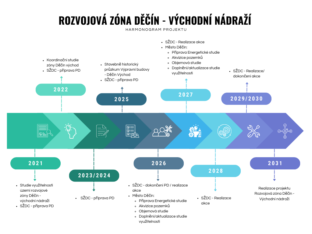 Projekt počítá s vytvořením nové rozvojové zóny, která přitáhne nové investory, případně poskytne prostor pro rozvoj stávajících podniků působících ve městě. Dále plánuje přestavbu výpravní budovy v multifunkční vzdělávací centrum, které poskytne zázemí pro fakulty ČVUT, včetně vytvoření specializovaných laboratoří, pro konferenční sál s kapacitou více než 200 lidí, a prostor pro popularizaci vědy a výzkumu nadmístního významu. Součástí plánované rozvojové zóny je i vytvoření dopravního polygonu pro potřeby ČVUT. Bloková zástavba vytvořená podél ulice 17. listopadu by mohla být následně využita pro výzkumná a vědecká pracoviště či laboratoře nebo služby vázané na podnikání a průmysl, technologické centrum či inovační hnízda. 2017 = uzavřeno Memorandum o partnerství a spolupráci při přípravě projektu Multifunkční vzdělávací centrum v budově nádraží Rakouské severozápadní dráhy v Děčíně mezi ČVUT, ÚK, městem Děčín, ČD, HSR – ÚK a HSR. 2019 = uzavřeno Memorandum o partnerství a spolupráci při přípravě projektu Rozvojové zóny v prostoru kolejiště nádraží Děčín – východ mezi SŽDC, ÚK, městem Děčín, ČD, OHD v Děčíně, HSR – ÚK a ČVUT. 2020 – 2021 = zpracována Studie využitelnosti území rozvojové zóny Děčín – Východní nádraží. 2020 = schválen záměr přestavby kolejiště Děčín Východní nádraží realizovaný SŽ. Také byly navrženy změny územního plánu v souladu s předkládaným záměrem, které by měly vstoupit v platnost v roce 2022. V dubnu 2021 = schválilo Zastupitelstvo města Děčín Studii využitelnosti území rozvojové zóny Děčín – Východní nádraží a odsouhlasilo, že nositelem projektu transformace zóny bude Statutární město Děčín. 2022 - zpracovaná Koordinační studie zóny Děčín východ 2023/24 - SŽ - příprava PD na zúžení kolejiště 2025 - Stavebně historický průzkum Výpravní budovy - Děčín východ 2026 - SŽ - dokončení PD a zahájení realizace projektu Tento